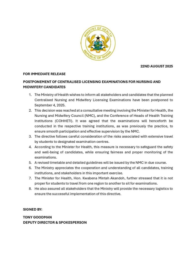 The Ministry of Health has announced the postponement of the Centralized Nursing and Midwifery Licensing Examinations to September 4, 2025, citing concerns over the risks associated with extensive travel to designated examination centers. In a statement signed by Tony Goodman, Deputy Director and Spokesperson, the Ministry explained that the exams will now be conducted in respective training institutions to ensure smooth participation and effective supervision by the Nursing and Midwifery Council (NMC).