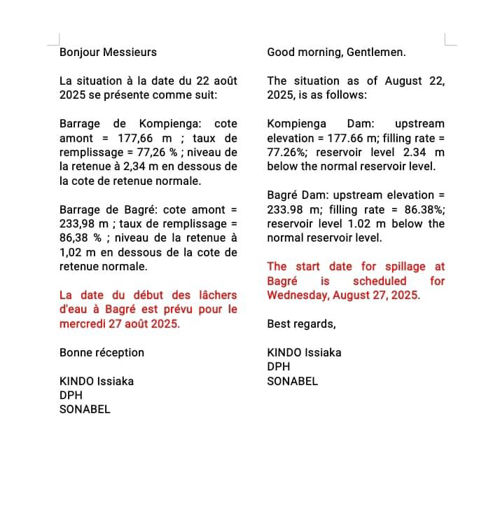 Officials in Burkina Faso have announced that the Bagre Dam is set to start releasing water on Wednesday, August 27, 2025.
