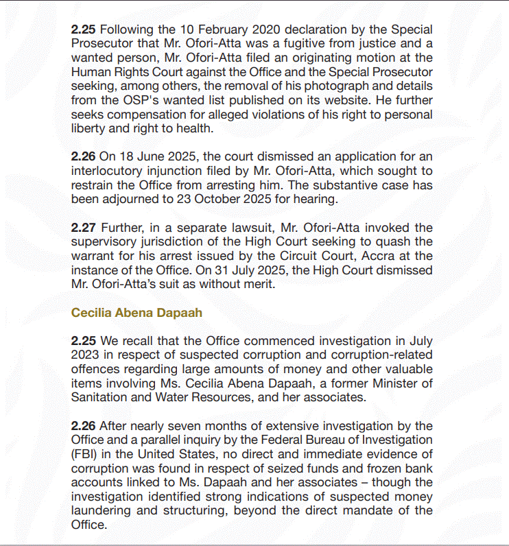 “After nearly seven months of extensive investigation by the Office and a parallel inquiry by the Federal Bureau of Investigation (FBI) in the United States, no direct and immediate evidence of corruption was found in respect of seized funds and frozen bank accounts linked to Ms. Dapaah and her associates – though the investigation identified strong indications of suspected money laundering and structuring, beyond the direct mandate of the Office.”