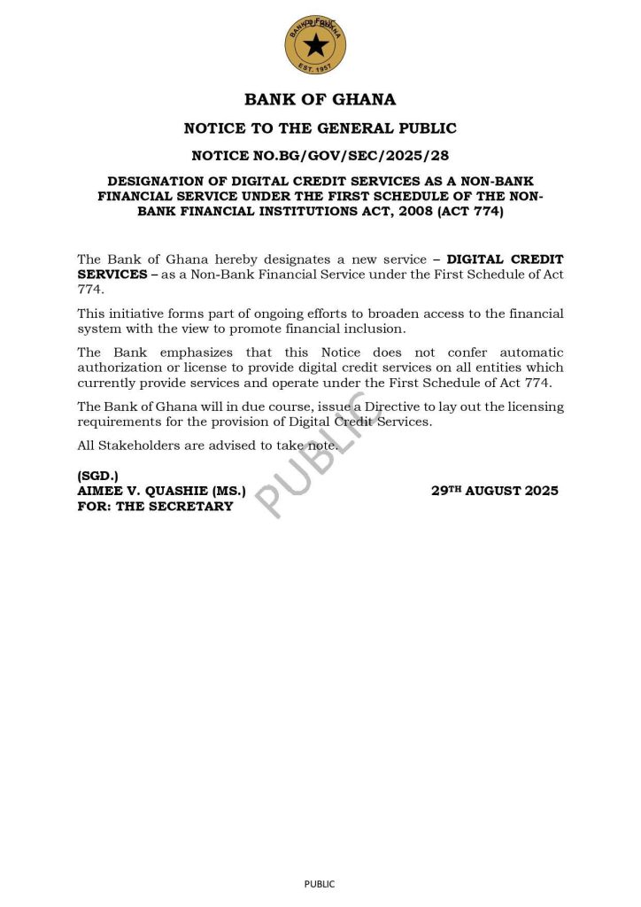 “The Bank of Ghana will in due course, issue a directive to lay out the licensing requirements for the provision of digital credit services. All stakeholders are advised to take note”, the Bank said in a statement on Friday, August 29, 2025.
