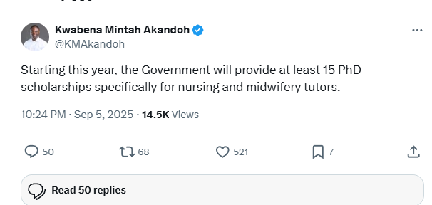 Minister of Health Kwabena Mintah Akandoh announced via Twitter on Friday, September 5, 2025, that the government will launch a new scholarship program specifically targeting tutors in nursing and midwifery training institutions.