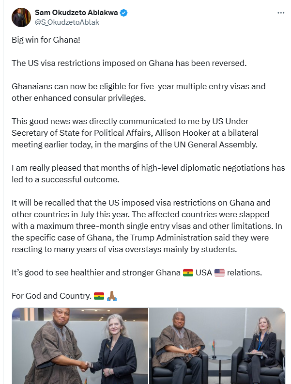The Minister of Foreign Affairs, Samuel Okudzeto Ablakwa, has announced that the United States has reversed the visa restrictions previously imposed on Ghana.
