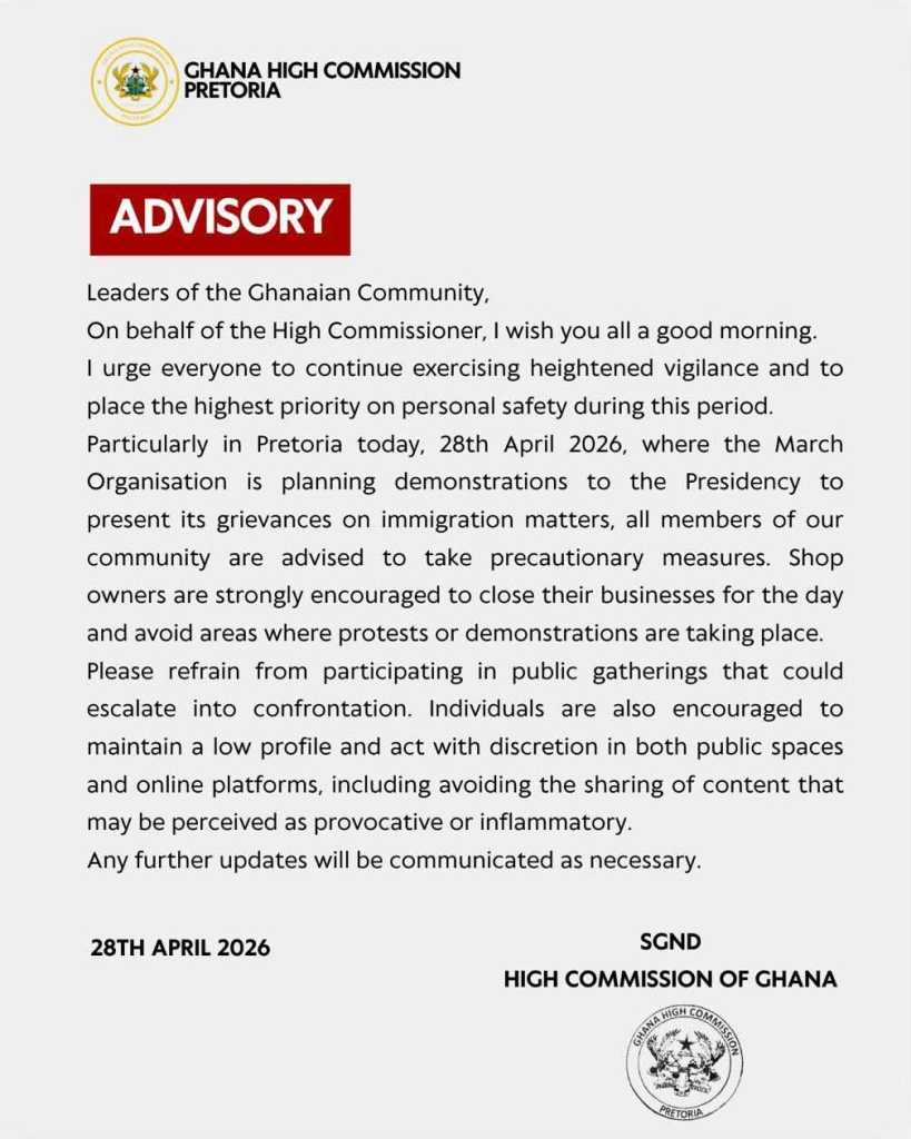 The Ghana High Commission in Pretoria has urged members of the Ghanaian community in South Africa to exercise heightened caution ahead of planned demonstrations over immigration issues.